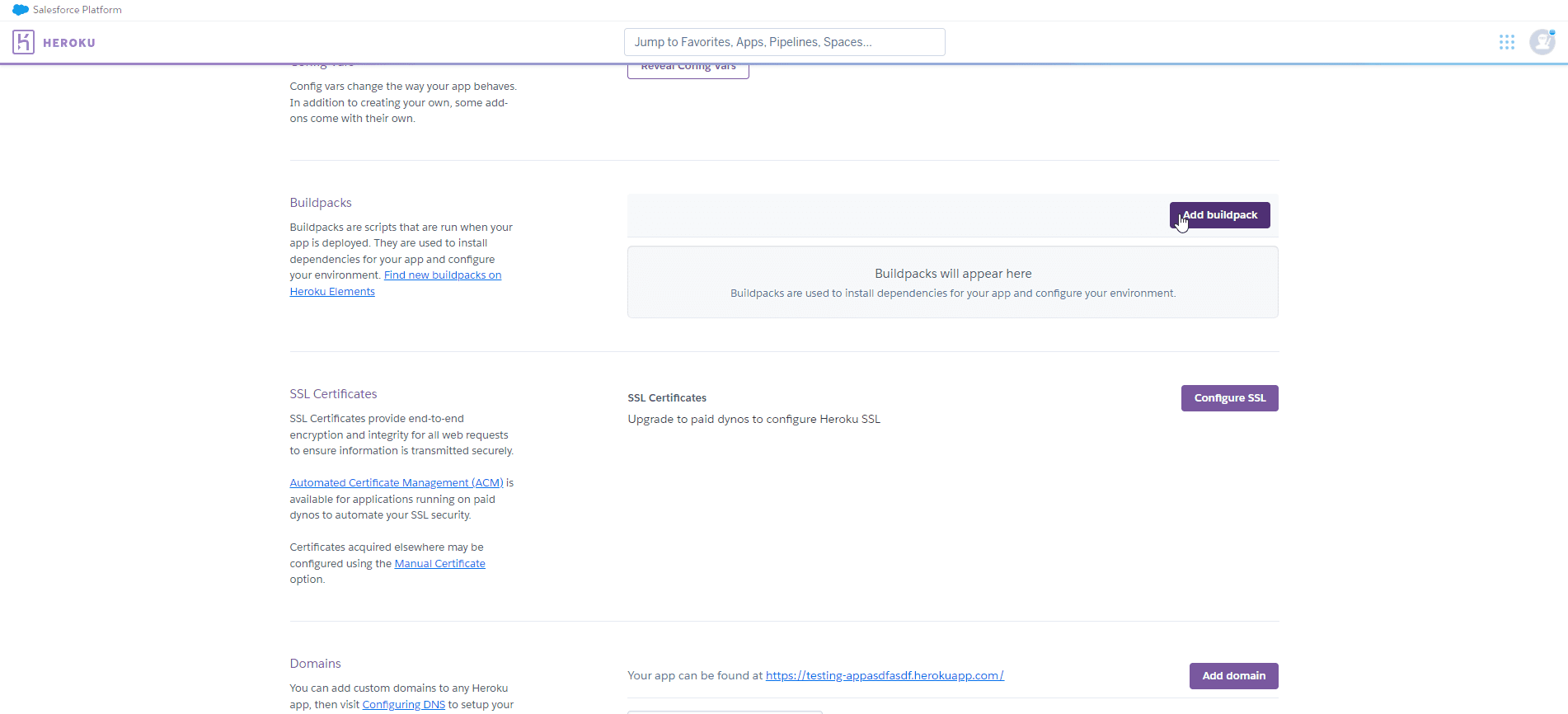 - Go to the settings of each app and set the buildpacks. These scripts run when your app is deployed.